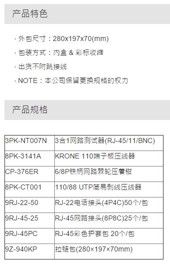 | 4A0046 | 1PK-940 | 包含:网络测试器、电话接头、网络接头等 | 套 | ¥1080.00元 | 7-15天 |